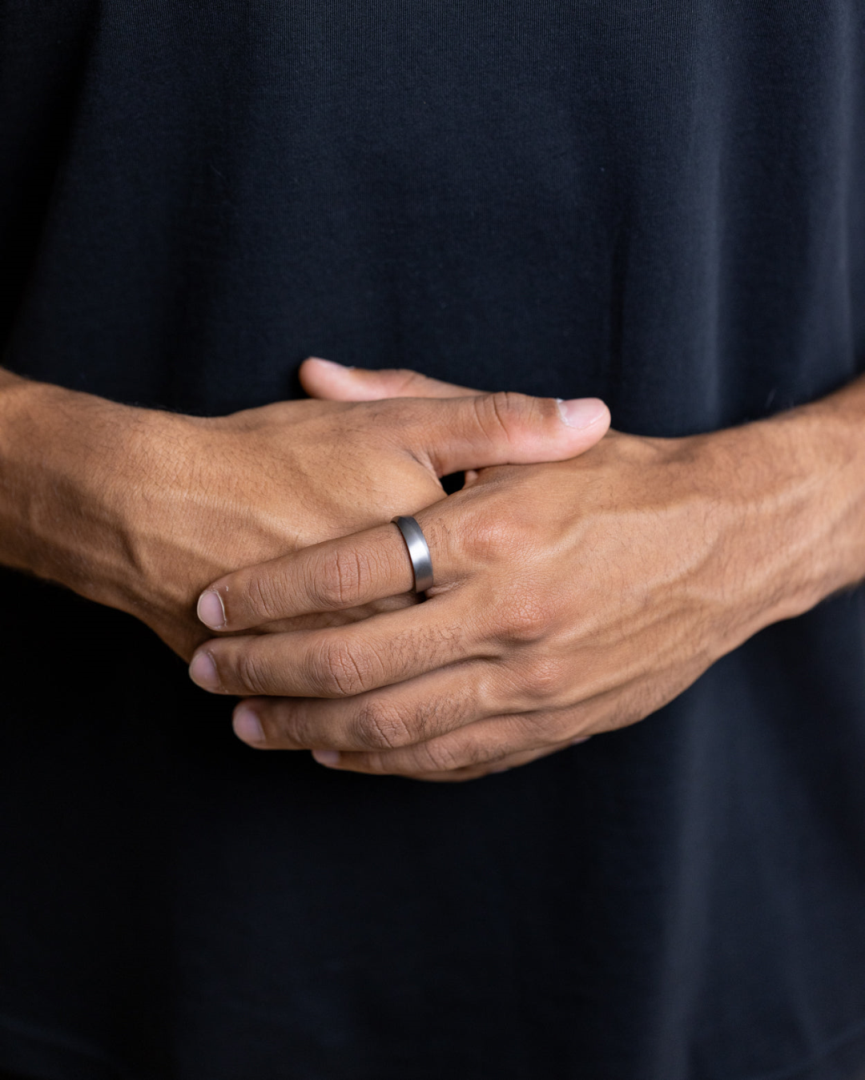 De 6 mm brede ring biedt een stevige aanwezigheid om de vinger zonder zwaar aan te voelen, dankzij het gebruik van graad 2 titanium.