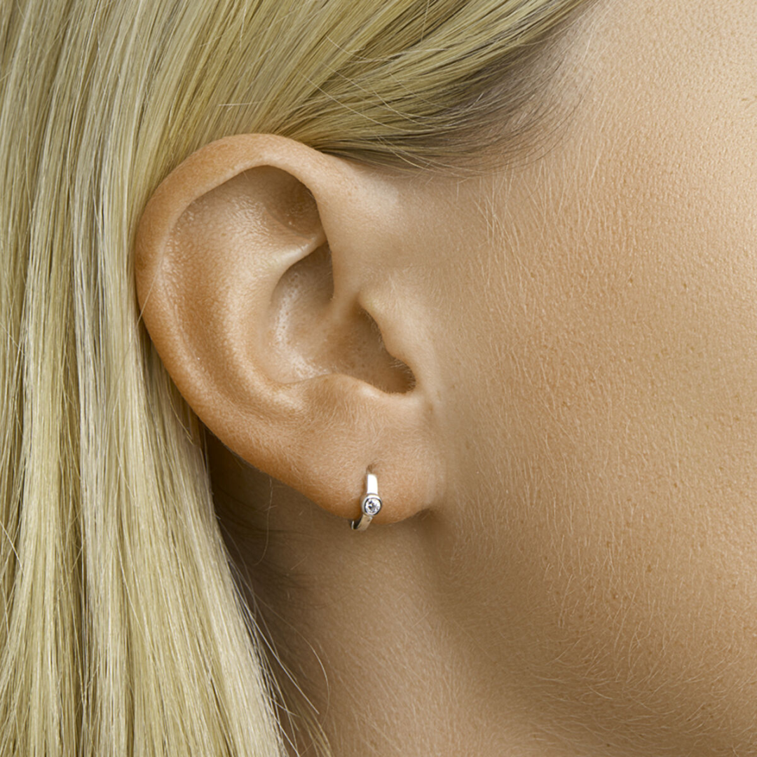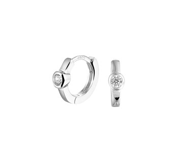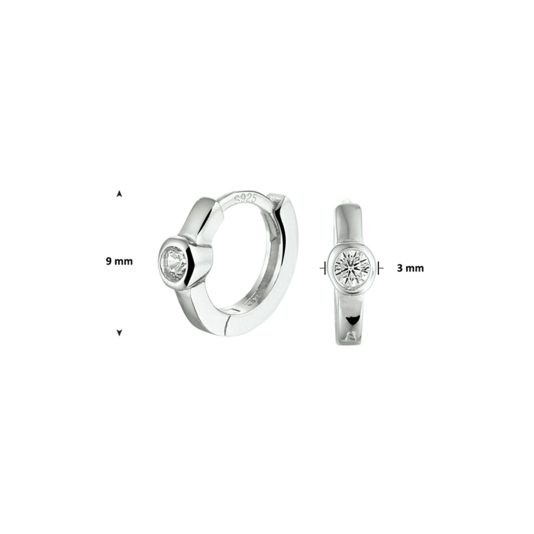 Gerhodineerd 925 zilveren oorringen met scharnier uitgevoerd met een heldere zirkonia. De oorringen hebben een diameter van 9mm.
