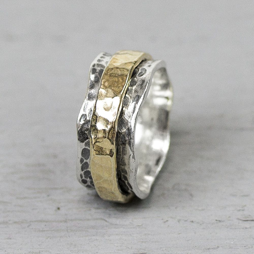 RIng gemaakt van 925 sterling zilver, geoxideerd zilver en goldfilled. Deze ring loopt rond aan de binnenkant, hierdoor heeft hij een fijne pasvorm. De ring heeft een brede goldfilled band en golven aan de zijkant.