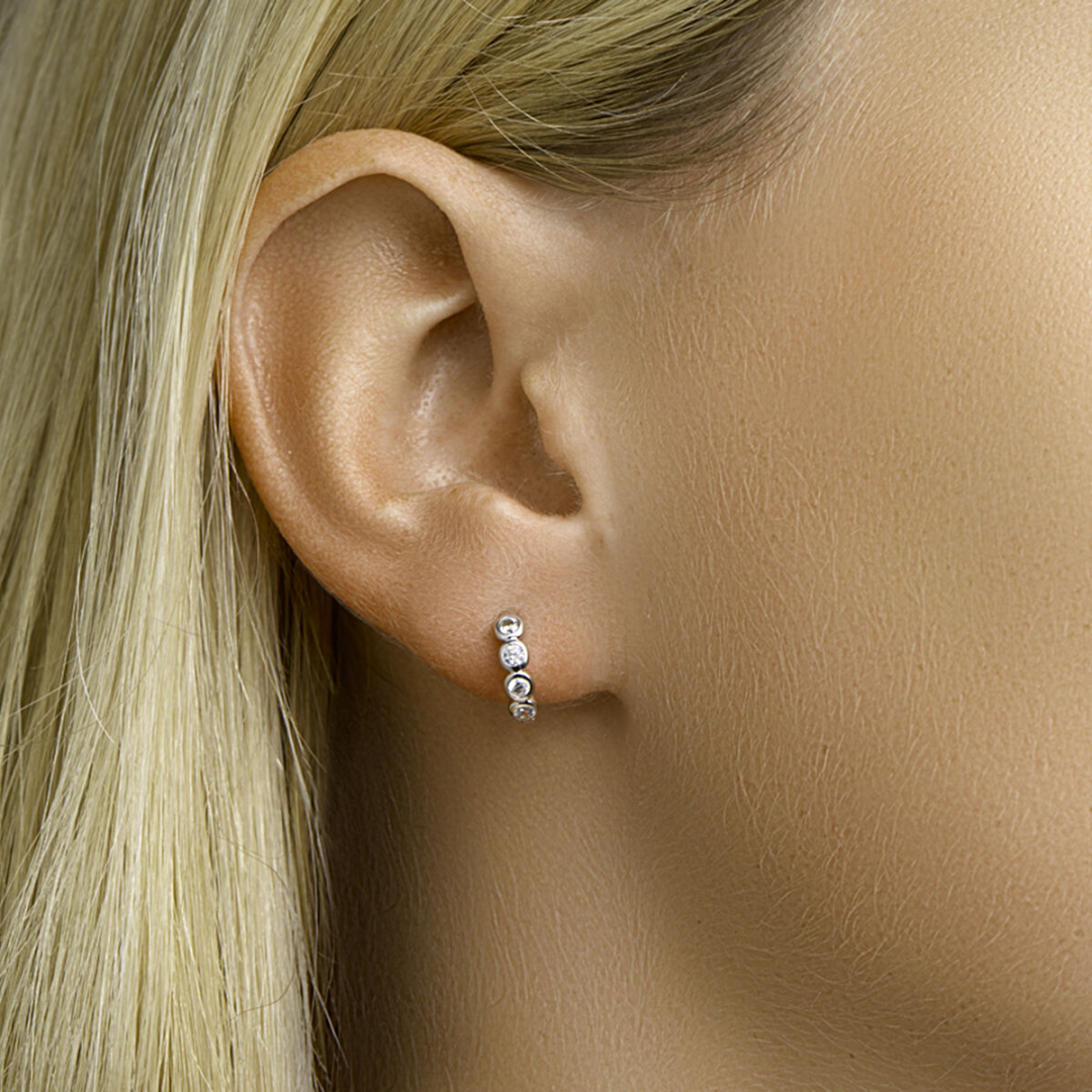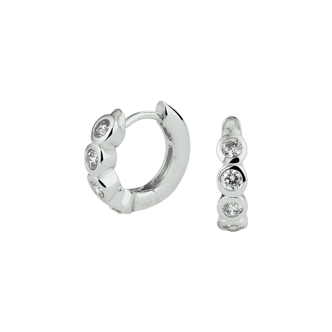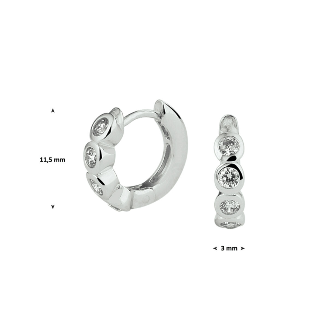 Gerhodineerd zilveren oorringen uitgevoerd met een luxe rijzetting van briljant geslepen zirkonia en stevige scharnier sluiting. De oorringen zijn een ware eyecatcher en voegen een subtiele hoeveelheid glamour toe aan iedere outfit.