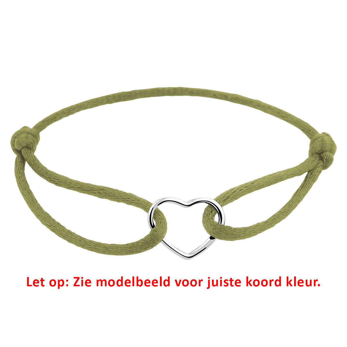 Mosgroen gevlochten armband uitgevoerd met een gerhodineerd 925 zilveren hartje. De armband heeft draaglengtes van 13 tot 26cm. Het hartje heeft een afmeting van 12.5x15.5mm