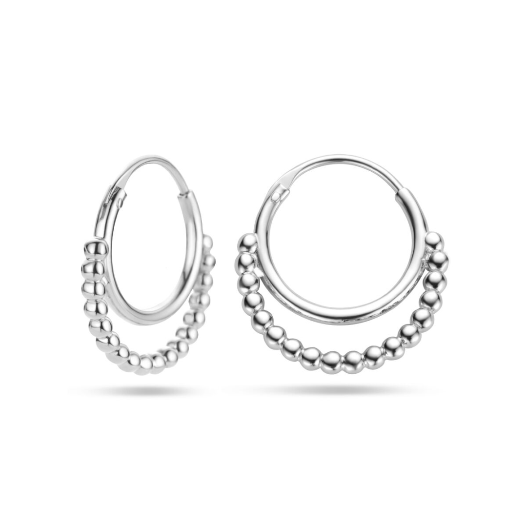 Gerhodineerd 925 zilveren oorringen uitgevoerd met bolletjes. De oorringen hebben een totale hoogte van 16mm.